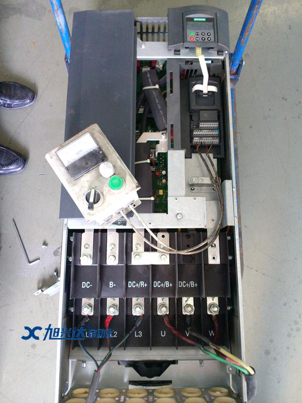拆開機器就發現嚴重的短路現象,整流模塊和IGBT模塊爆裂,短路造成的黑色積炭噴得到處都是,主回路兩個繼電器也爆開,主控板暫時沒有發現問題,但驅動部分燒了好幾處,另外儲能大電容一部分都已發漲,電容板上的兩顆大螺絲接觸處全部燒焦,這就是西門子420系列變頻器的通病,因為所有電量都是要經過這兩顆鐵螺絲,一旦鐵螺絲生銹,很容易引起電容的充放電不良,這樣電容發熱,漏電,發漲到最后損壞重要器件就不在話下了,為了防止再次接觸不良打火,在上螺絲同時最好焊上幾股粗銅線并存螺絲位上好,維修觸發板時不知道參數的,可以從控制板上完好的器件與損壞相同的對比,修復該板的正向電壓為4.7伏,負向電壓為 -4.44伏,更換損壞器件后,可以加電試驗,試驗步驟按主回路主控制空載,負載分別運行檢查。