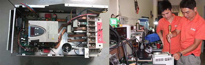 如果設備經常“LU欠電壓”報警,則可考慮將變頻器的參數初始化(H03設成1后確認),然后提高變頻器的載波頻率(參數F26)。若E9設備LU欠電壓報警且不能復位,則是(電源)驅動板出了問題。