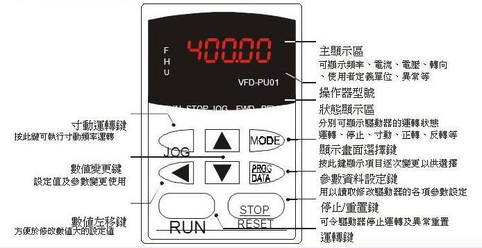 一般的變頻器都有運行(RUN)、停止(STOP)、編程(PROG)、數據/確認(DATA/ENTER)、增加(UP、▲)、減少(DOWN、▼)等6個鍵,不同變頻器操作鍵的定義基本都是相同的。此外有的變頻器還有監視(MONTTOR/DISPLAY)、復位(RESET)、寸動(JOG)、移位(SHIFT)等功能鍵。