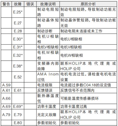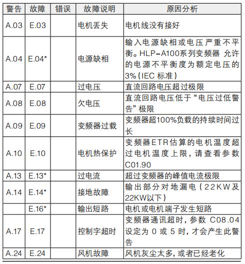 警告說明變頻器由于某種原因工作狀態已經接近設計極限,但仍然可以繼續工作。如果產生原因不復存在,警告將消失;如果產生原因持續存在甚至更加嚴重,則變頻器將報故障。警告產生時,面板顯示“A.XX”(XX指數字)。