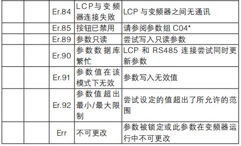 錯誤說明變頻器正存在某種狀態,而無法進行某項操作。錯誤產生時,面板顯示“Er.XX”(XX指數字)。