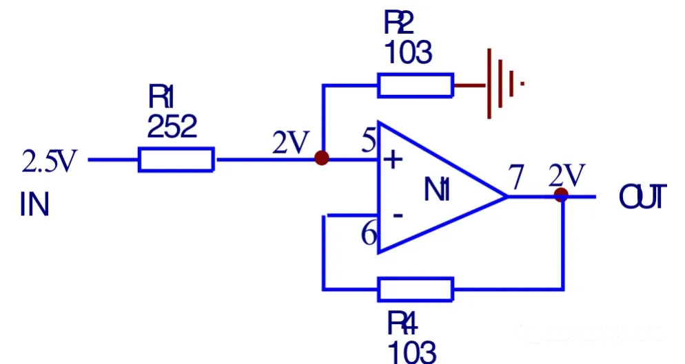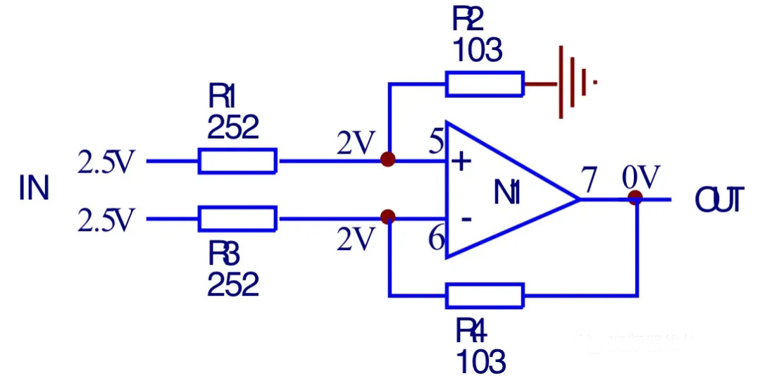 故障現(xiàn)象同上。測(cè)5、6、7腳均為2.5V。1、放大器的“虛短”規(guī)則仍然成立,N1芯片是好的。2、進(jìn)一步分析,此時(shí)由于同相輸入端的分壓電路異常,導(dǎo)致原差分放大器的“輸出虛地”條件被破壞,如圖5所示。故使輸出電壓由0V上升為2.5V。判斷故障為R2斷路或虛焊,引起同相輸入端的輸入電壓上升。測(cè)量確如判斷,代換R2后N1輸出正常。