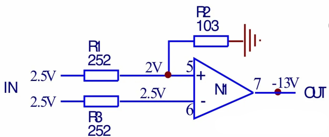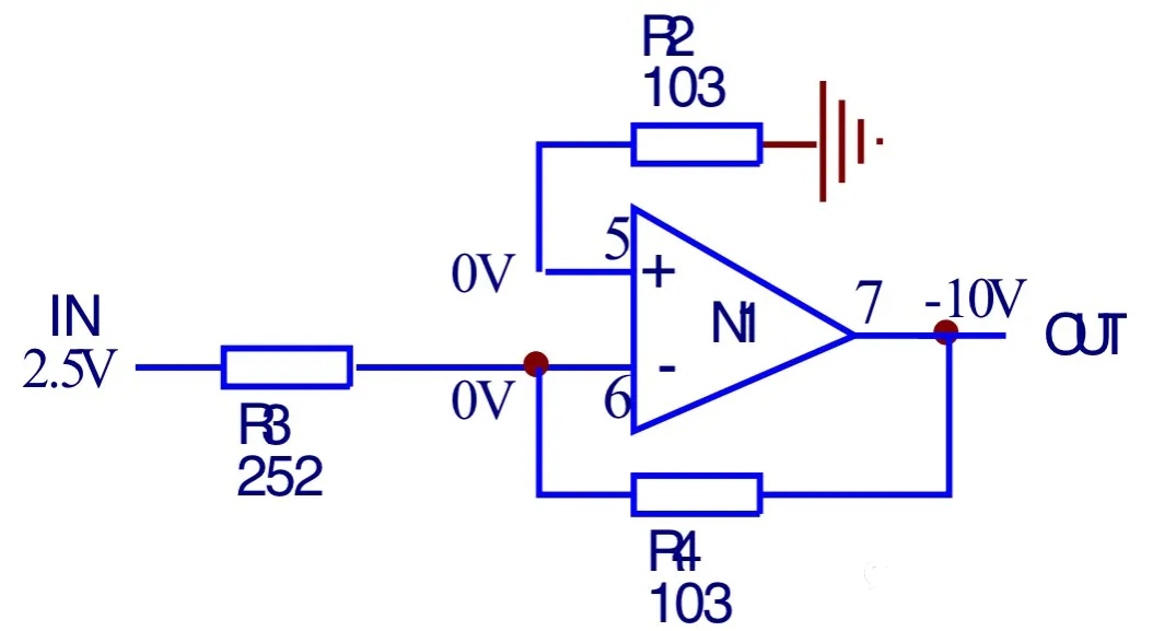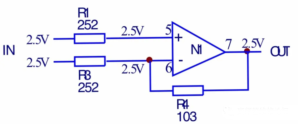 故障現(xiàn)象同上。測(cè)5腳為0V,6腳為0V,7腳為-10V。1、放大器的“虛短”和反相放大器的“虛地”規(guī)則仍然成立,N1芯片是好的。2、進(jìn)一步分析,此時(shí)差分放大器變身為反相放大器,如圖4所示。判斷故障為R1斷路或虛焊,引起同相輸入端的輸入信號(hào)電壓丟失,而反相輸入端的2.5V被四倍反相放大。查R1有虛焊現(xiàn)象,補(bǔ)焊后故障排除。