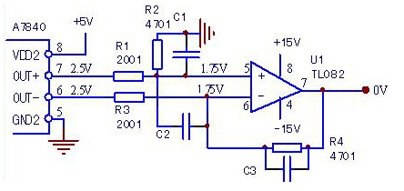 現(xiàn)測U1的輸入、輸出端電壓均為2.5V,判斷U1是好的,故障為U1偏置電路或A7840異常所致。測A7840的6、7腳輸出電壓均為2.5V,正常。故障局限于R1、R2分壓電路異常,如R2虛焊或斷路,將導(dǎo)致2.5V的故障電壓輸出。