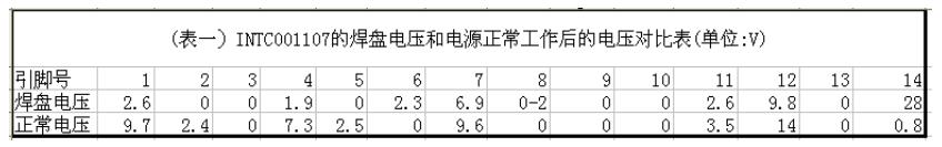 第六步:繼續整理資料:電源正常后測得 INTC001107 各腳電壓如表 1 所示。因整塊電路板上覆蓋有保護膠膜,為了不再使它受到更大的破壞,電路圖就不再繪出了。相信以手頭既有的文字資料也能滿足日常維修工作的需要。