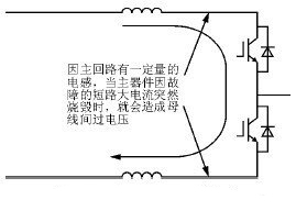 有些變頻器損壞的現(xiàn)象使人感到納悶,母線間的某個(gè)間距并不小,但有尖端放電可能的區(qū)域,出現(xiàn)打火電蝕的痕跡。仔細(xì)檢查發(fā)現(xiàn)有某主器件被損壞,究竟是不是間距不夠造成的后果呢?不是的,這是因主回路有一定的電感,當(dāng)主器件因故障的短路大電流突然燒毀時(shí),就會(huì)造成母線間過(guò)電壓(見(jiàn)圖4)。逆變橋開(kāi)關(guān)器件IGBT短路會(huì)造成正負(fù)母線間打火;整流橋短路或逆變IGBT 短路有可能造成進(jìn)線處打火或進(jìn)線保護(hù)用壓敏電阻損壞,因進(jìn)線也有電感,也會(huì)造成過(guò)電壓。