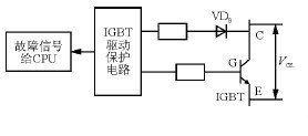 當(dāng)IGBT正常導(dǎo)通時(shí)其飽和壓降很低,當(dāng)IGBT過(guò)電流時(shí)管壓降VCE會(huì)隨著短路電流的增加而增大,增大到一定值時(shí),檢測(cè)二極管VDB將反向?qū)ǎ藭r(shí)反向電流信號(hào)經(jīng)IGBT驅(qū)動(dòng)保護(hù)電路送給CPU 處理器,CPU 封鎖IGBT 輸出,以達(dá)到保護(hù)作用。如果檢測(cè)二極管VDB損壞,則康沃變頻器會(huì)出現(xiàn)ER15 故障,現(xiàn)場(chǎng)處理時(shí)可更換檢測(cè)二極管以排除故障。