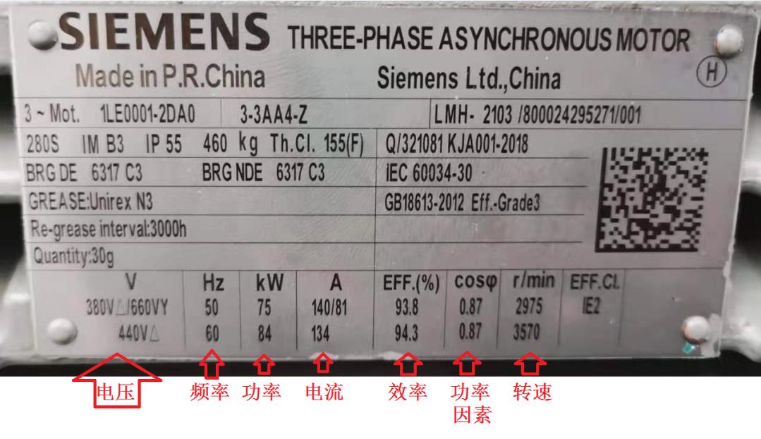 1)確認電機參數:在變頻設備的99組參數中設定電機功率、電流、電壓、轉速、最高頻率等參數,可直接從電機銘牌中獲得;