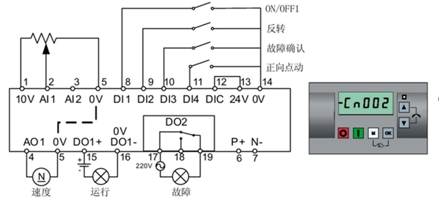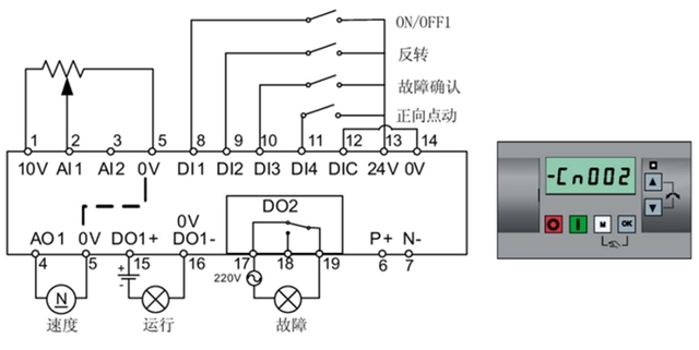 3. 通常端子控制,需要外接指示燈來確認變頻器狀態,當DO2輸出故障時,解除故障可通過DI3端子復位(故障未消除情況下無效)。