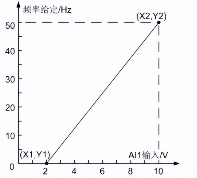 P0760[0]=100.00,直線上第二個點的縱坐標Y2為100%,對應50Hz