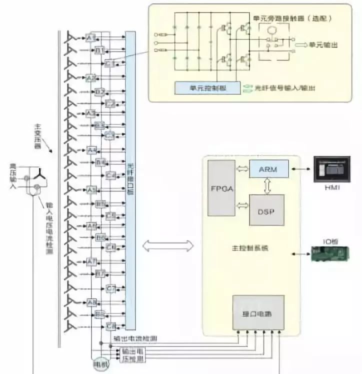 功率單元采用三相交流輸入,整流濾波后形成直流電壓,經IGBT H橋逆變后輸出脈寬調制(PWM)電壓。功率單元控制板由IGBT驅動電路和監測保護電路、光纖通信電路、單元旁路電路和控制電源組成。運行中功率單元故障時,變頻器可將故障單元自動旁路并繼續運行,等情況允許時再停機排除故障。