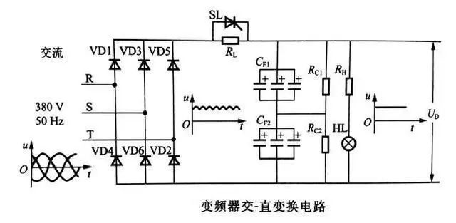 在SPWM變頻器中大多采用橋式全波整流電路,在中、小容量的變頻器中整流器件采用不可控的整流二極管或二極管模塊,如下圖所示變頻器交-直變換電路中的VD1~ VD6。當三相線電壓為380V時,整流后的峰值電壓為537V,平均電壓為515V。