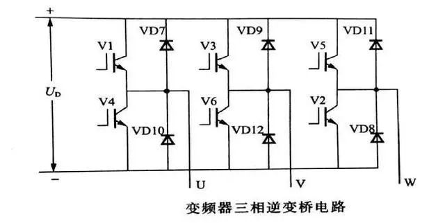 逆變橋電路的功能是把直流電轉換成三相交流電。逆變橋電路由下圖中的開關器件 V1~V6 構成。目前中、小容量的變頻器中,開關器件大部分使用IGBT 管。