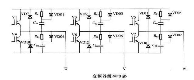 逆變管在關斷和導通的瞬間,其電壓和電流的變化率是很大的,有可能使逆變管受到損害。因此,每個逆變管旁還應接入緩沖電路,以減緩電壓和電流的變化率。緩沖電路的結構因逆變管的特性和容量等的不同而有較大差異,下圖所示的是比較典型的一種緩沖電路(由R01~R06、C01~C06、VD01~VD06構成)。