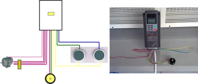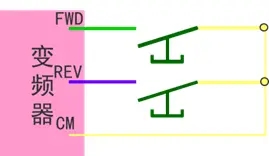 端子CM(黃線)、REV(藍線)、FWD(綠線)接按鈕開關。具體連線方法如下圖所示: