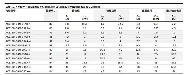 根據電機的類型,選擇對應的負載功率類型。變頻器的選型樣本中,都有對應的功率,下圖以ABB舉例