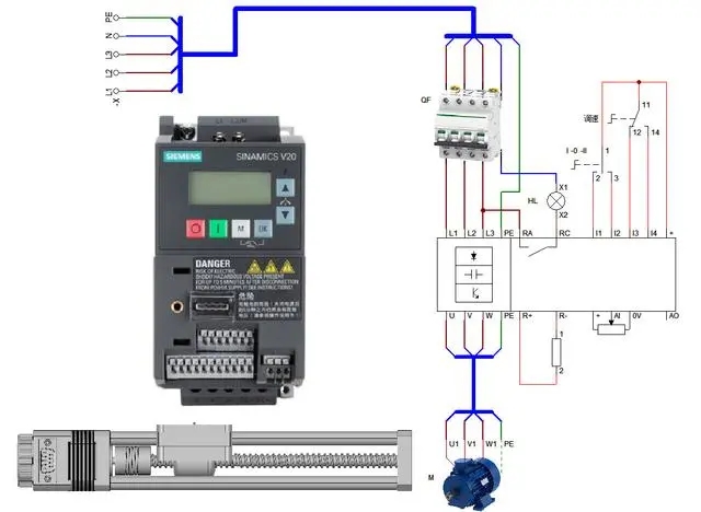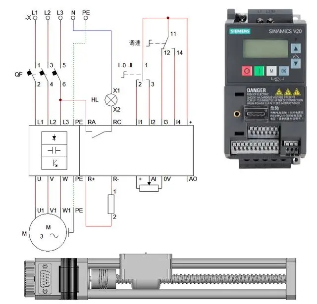 控制要求:變頻器外接按鈕SB1、SB2,SB1為三擋旋鈕開關,用來控制電機的正反轉,左檔位置電機正轉,中間位置(圖示位置)為停止,右檔位電機正轉,SB2為兩檔擋旋鈕開關,左檔位置(圖示位置)變頻器輸出頻率為低速(20Hz),右檔位置變頻器輸出頻率為高速(40Hz)。
