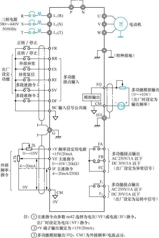 (2)控制電路配線端子F1、F2、FA、FB、FC(接點輸出)必須與其他端子分開配線。