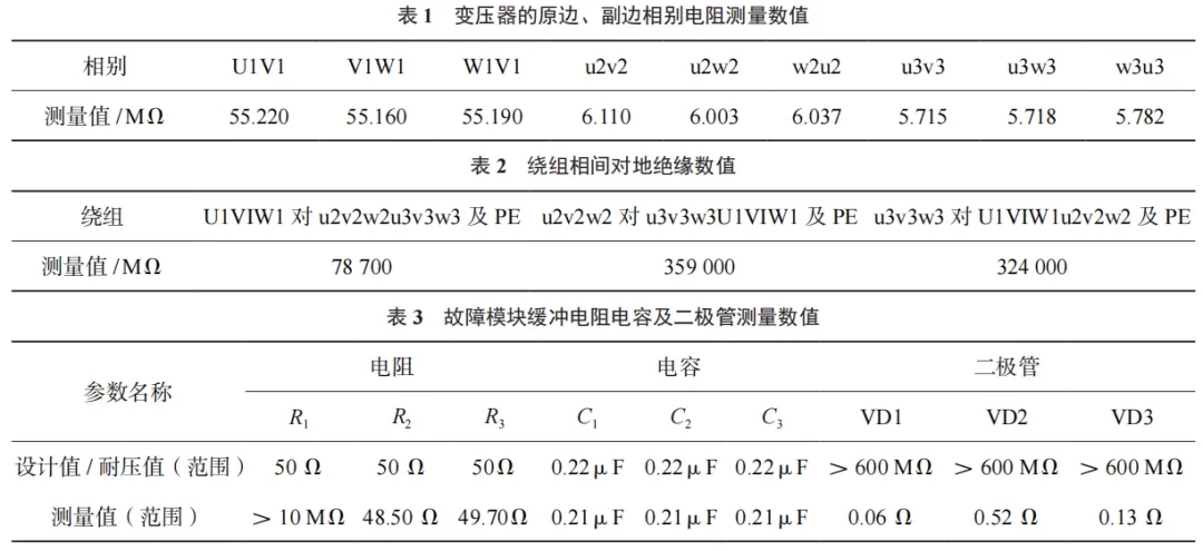 繞組相間對地絕緣數值見表 2,經分析均未發現異常,由此排除電源輸入模塊故障。