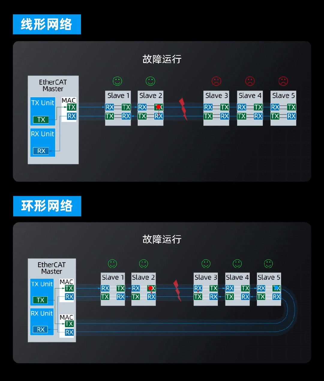 匯川AM760通過EtherCAT主站環(huán)形冗余設(shè)計(jì):使用雙網(wǎng)卡的環(huán)形拓?fù)浣Y(jié)構(gòu),即總線發(fā)生單點(diǎn)故障,也不影響其他從站的正常運(yùn)行;故障復(fù)位后,系統(tǒng)1秒內(nèi)完成環(huán)網(wǎng)重連,高效“自愈”,為食品冷鏈等對連續(xù)性要求極高的生產(chǎn)活動保駕護(hù)航。