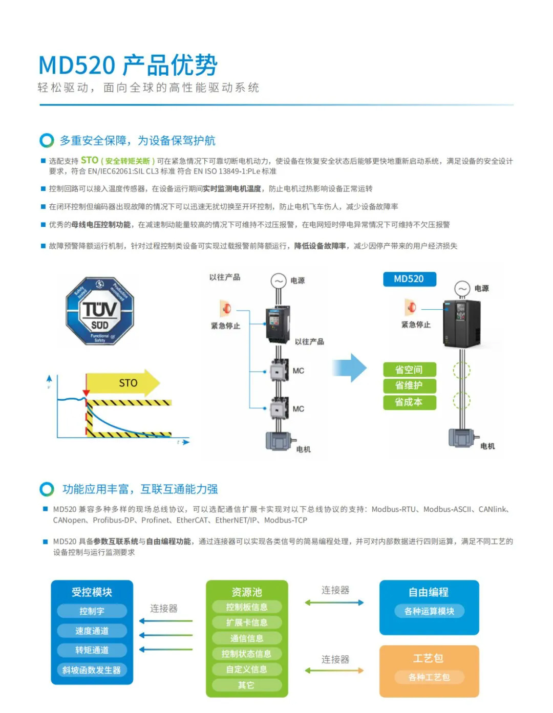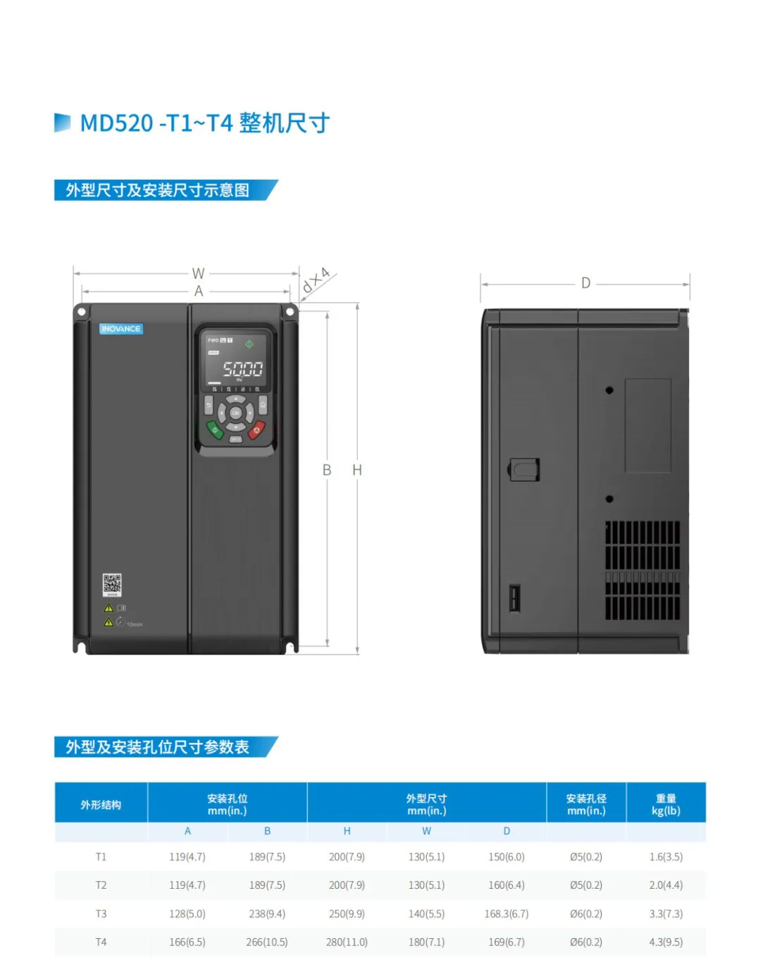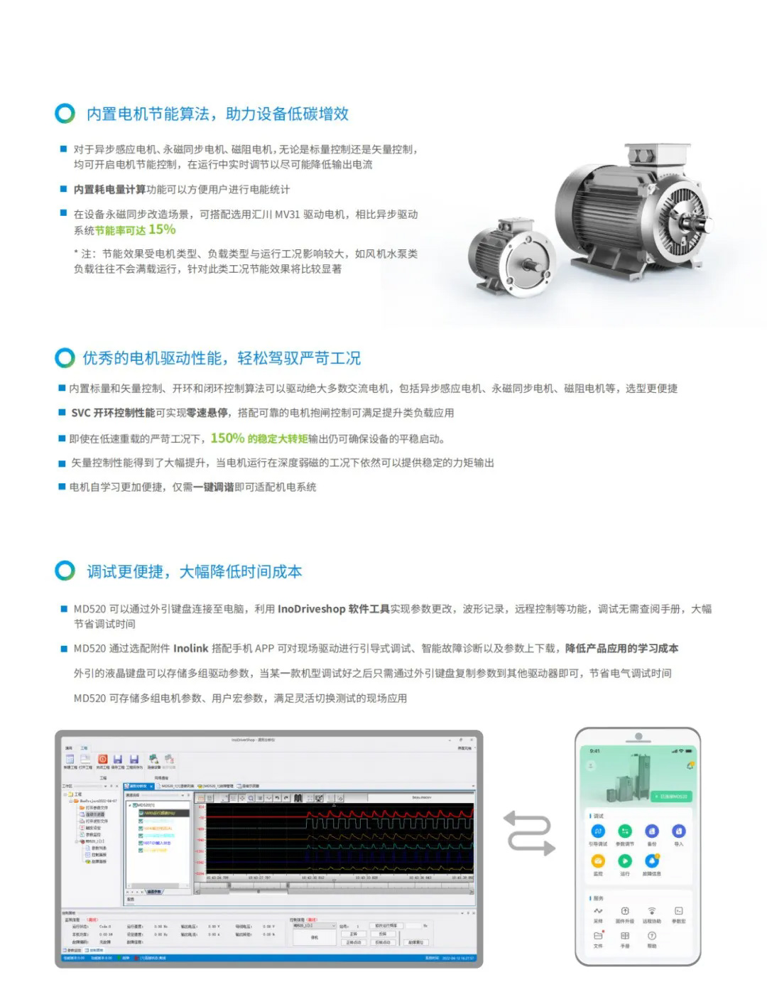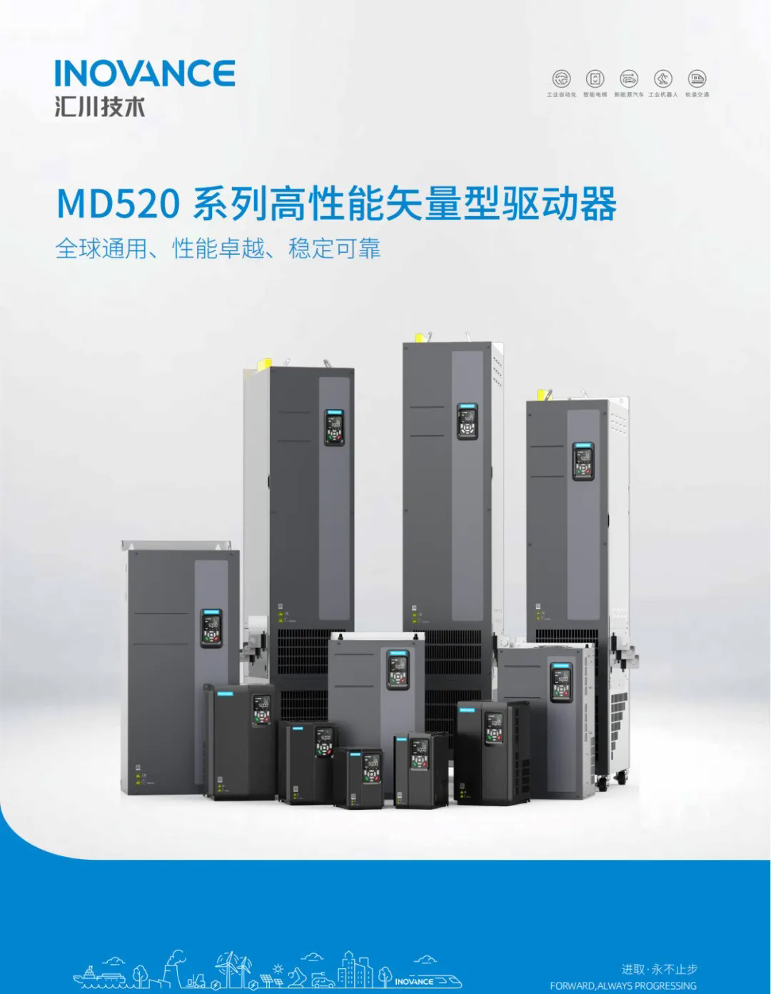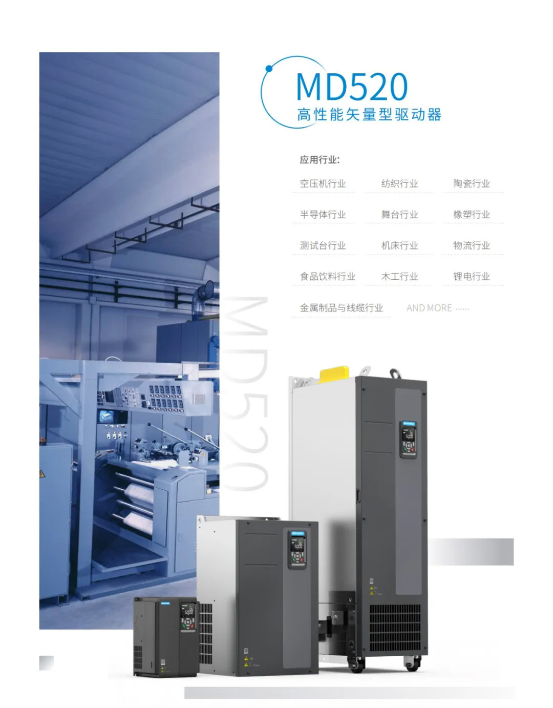 MD520系列變頻器是匯川的一款通用高性能電流矢量變頻器,主要用于控制和調節三相交流異步電機和三相交流永磁電機的速度和轉矩,可用于紡織、造紙、拉絲、機床、包裝、食品、風機、水泵及其他自動化生產設備的驅動。