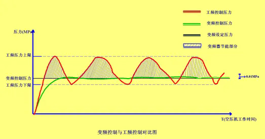 例如:假設實際用氣壓力為7Bar,工頻機組設定“工作壓力上限”和“工作壓力下限”分別為6bar和8bar。壓力就在8bar和6bar之間浮動,而電磁閥在8bar時卸載,6bar時加載,2bar壓差就帶來了高負荷電流損耗。圖中陰影部分即為節省的能耗。