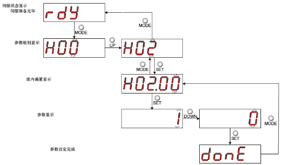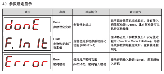 1. 許多參數運行中不能設置,但是DI5使能端子可能上電就導通,這時候面板顯示run狀態,像參數方向H02-02、脈沖選擇H05-01、H02-31恢復出廠設置、H0D-11點動、H0D-02慣量辨識都不能設置,必須是rdy狀態,這時候需要去掉使能。