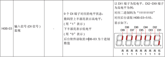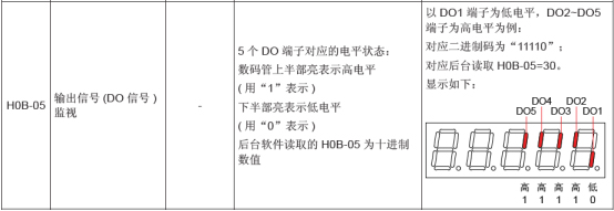3、H0B-05,可以監控DO狀態,比如DO1用了抱閘輸出這個功能,若使能的情況下,抱閘應該松開,若仍然抱住,就可以通過看H0B-05的高低電平來判斷DO輸出是否正常,使能情況下,理論上D01應該是低電平;