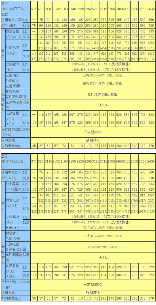 注: 1.表示適用電機容量是以使用三菱標準4極電機時的最大適用容量。