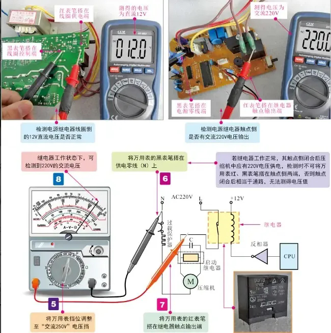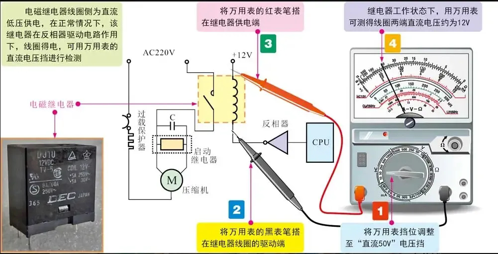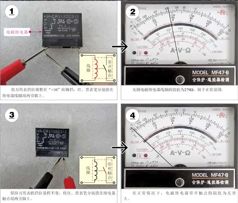 使用萬用表電壓擋檢測電磁繼電器,需要滿足一定的供電條件和環境。實際檢測時,需要特別注意人身安全,操作人員應避免身體任何部位與帶有220V電壓的器件或觸點碰觸,否則可能會引起觸電危險。